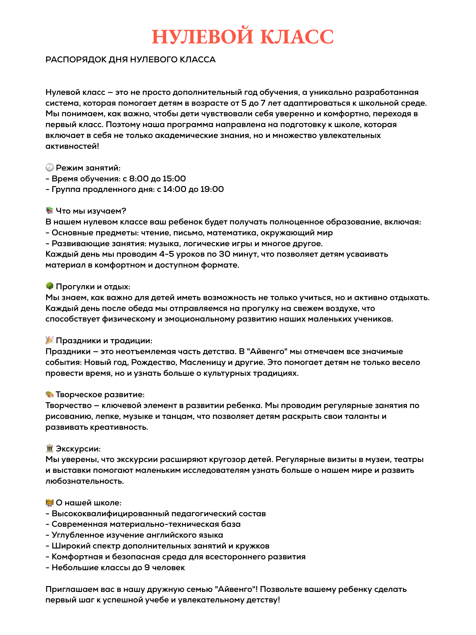 В нулевом классе акцент делается на развитие речи, математики, логического мышления, а также социальных навыков и творческих способностей через игры и занятия.